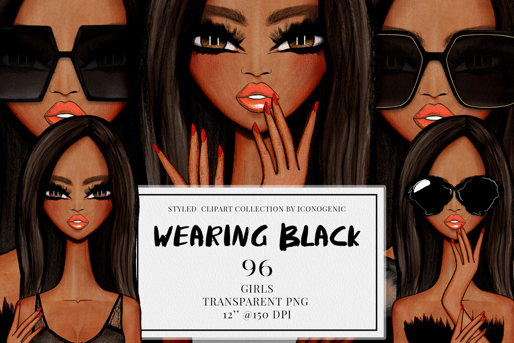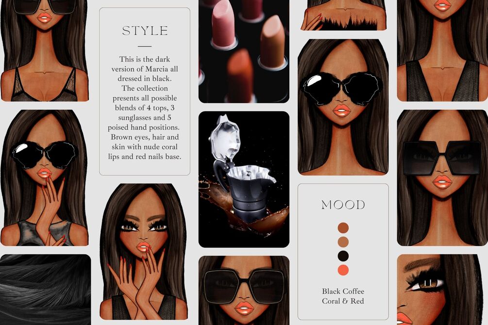 Styled collection of cute illustrated girl avatars presents all possible blends of 4 tops, 3 sunglasses and 5 graceful hands positions.